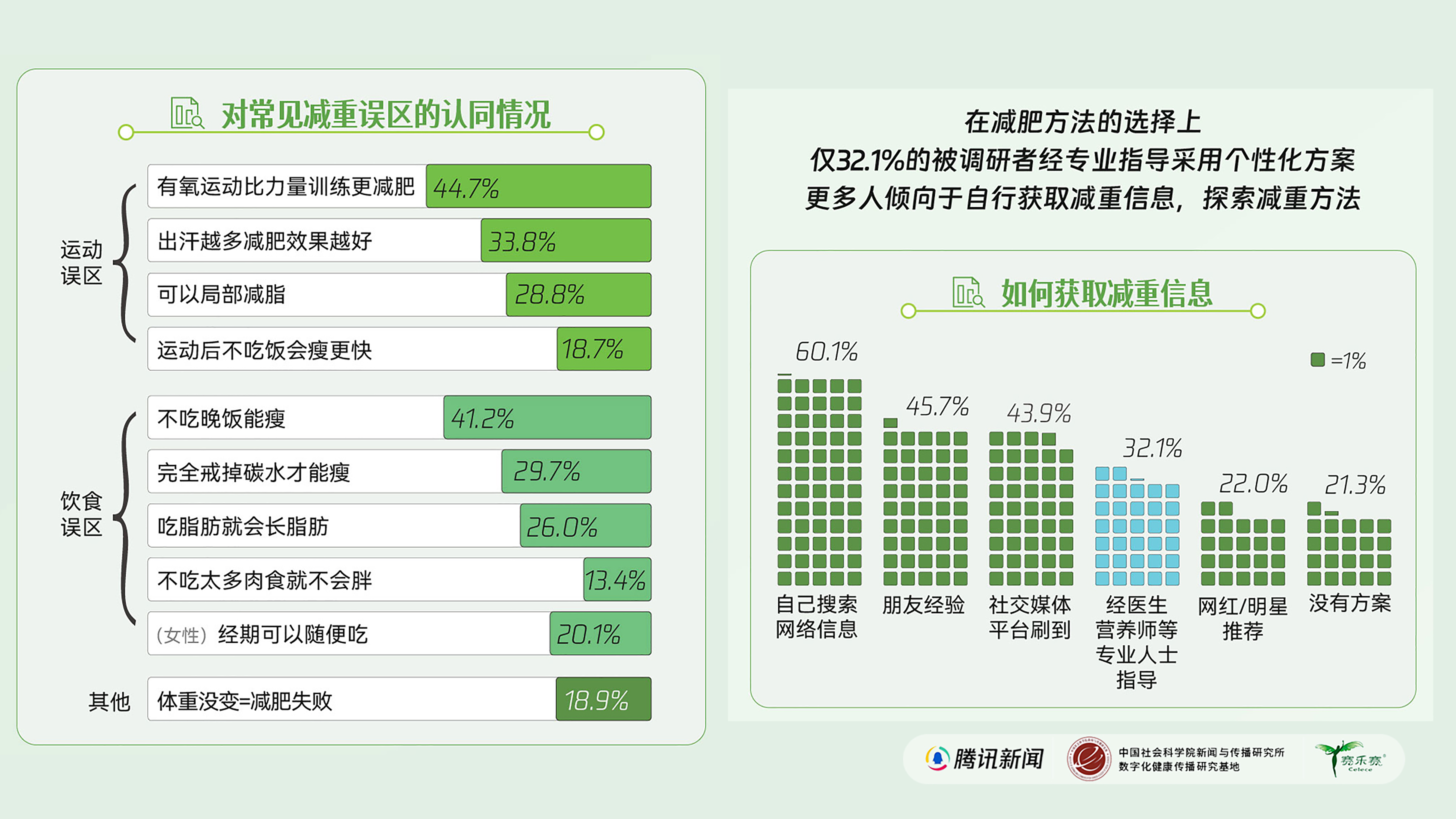 《藍皮書》揭示了大眾在減重認知上存在顯著誤區。近半數(47.6%)的被調研者高估了運動的作用,認為運動與飲食同等重要或運動更為關鍵。同時,流行于網絡的片面或錯誤觀點仍被大量人群認同,例如,44.7%的人認為“有氧運動比力量訓練更減肥”,41.2%的人相信“不吃晚飯能瘦”。