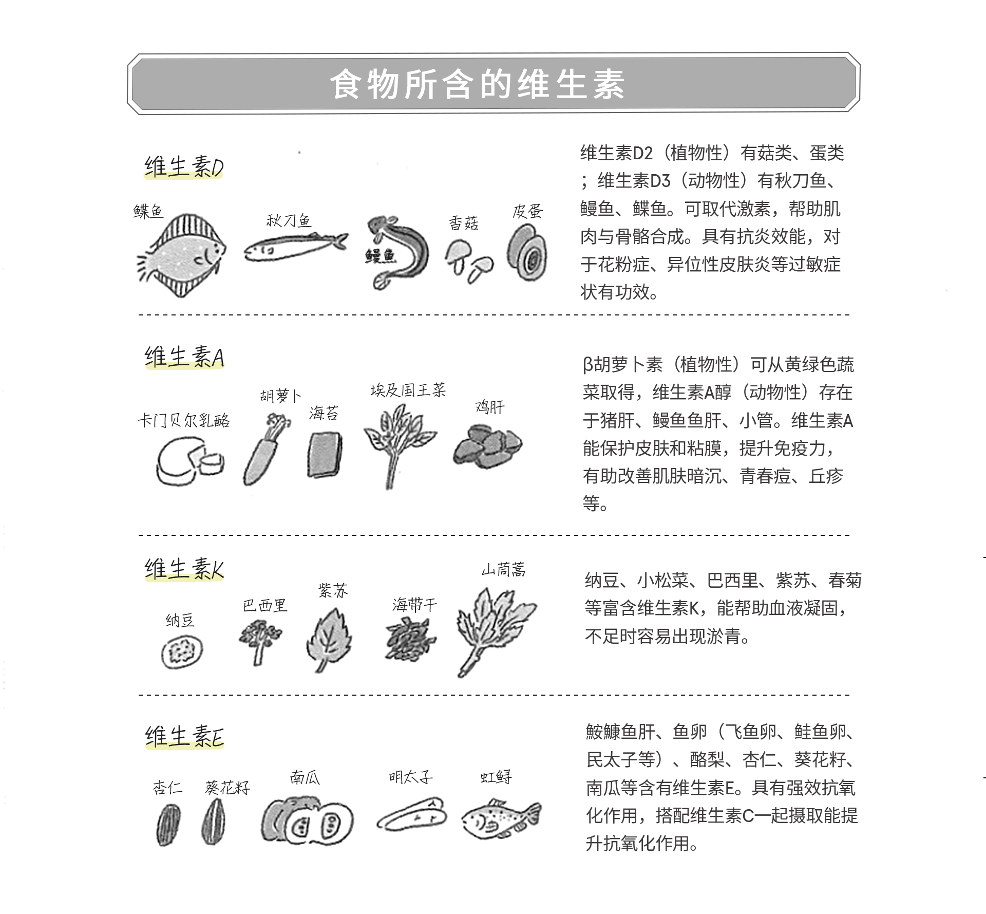 10. 維生素大致分為水溶性和脂溶性兩類。水溶性維生素無法在體內積存,所以要持續攝入。脂溶性維生素可從動物性食品中攝取獲得。