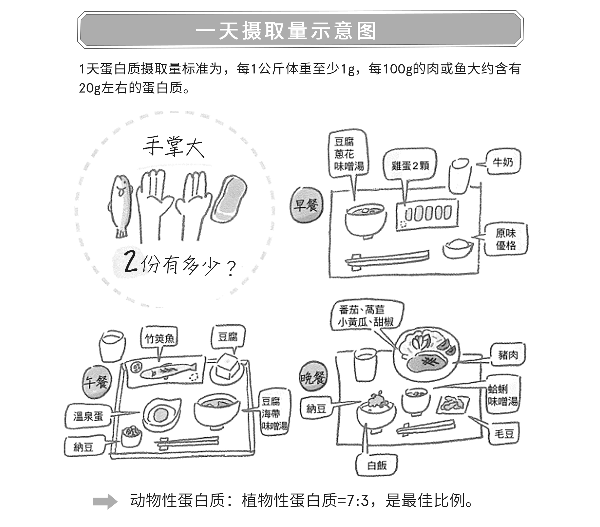 蛋白質:肉蛋豆魚。