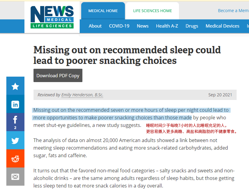 news-medical.net研究介紹:睡眠時間少于每晚7小時的人比睡眠充足的人,更容易攝入更多高糖、高鹽和高脂肪的不健康零食。